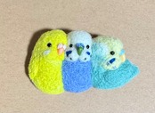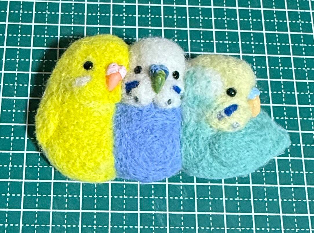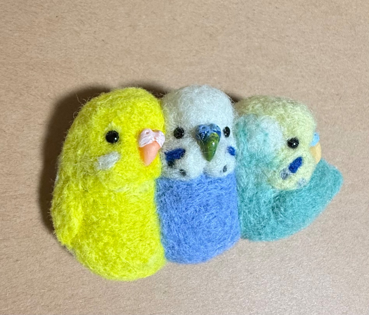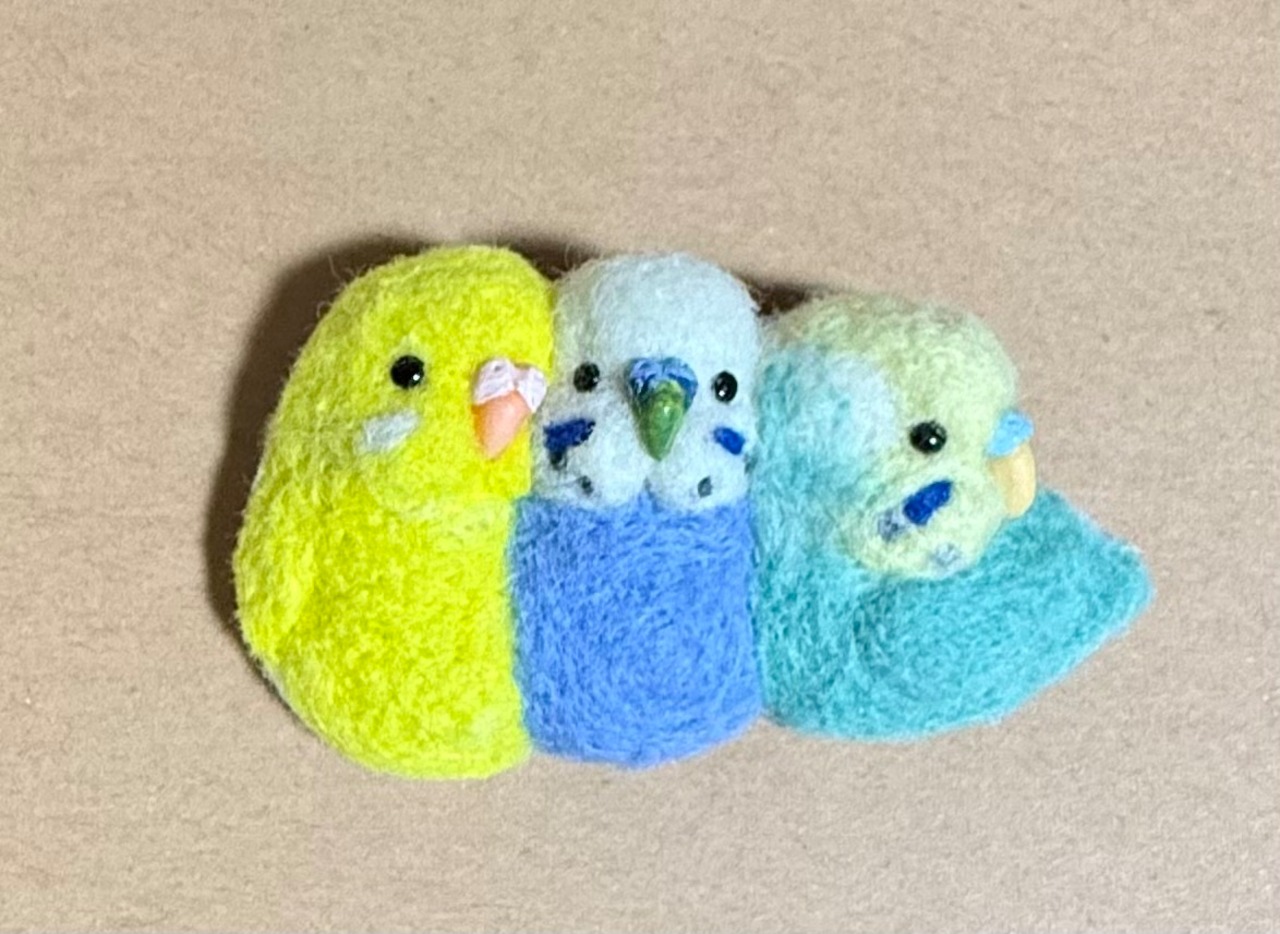 羊毛フェルト等で可愛い仲良しセキセイインコ3羽ブローチを作製いたしました^_^