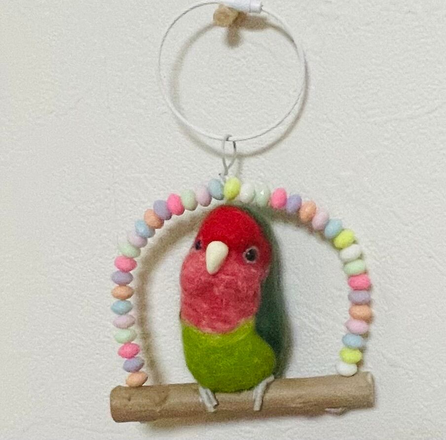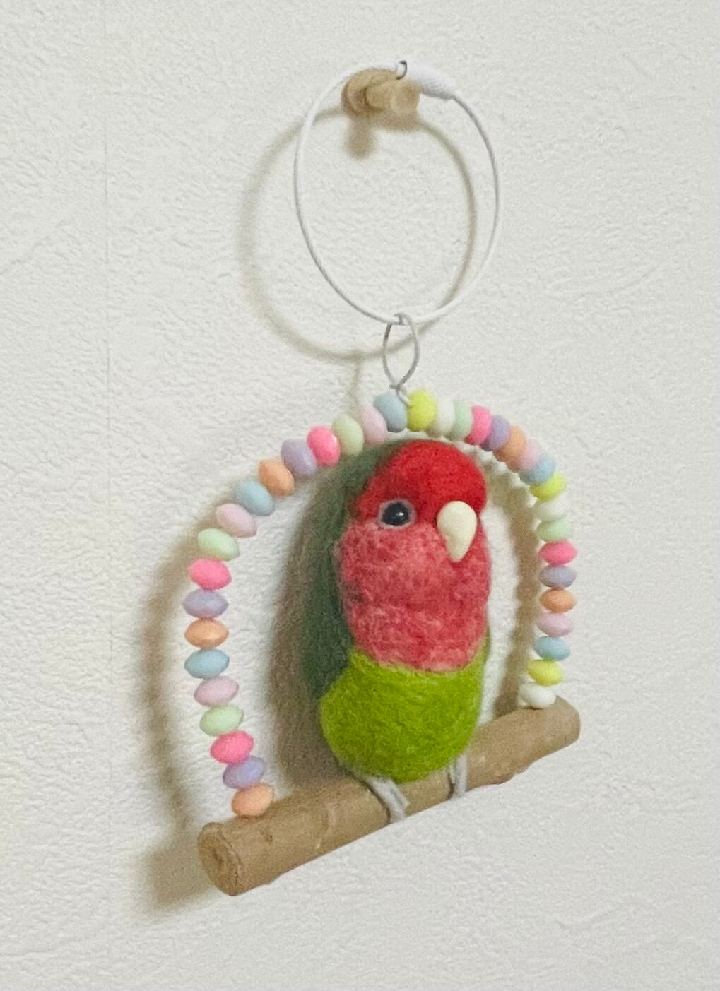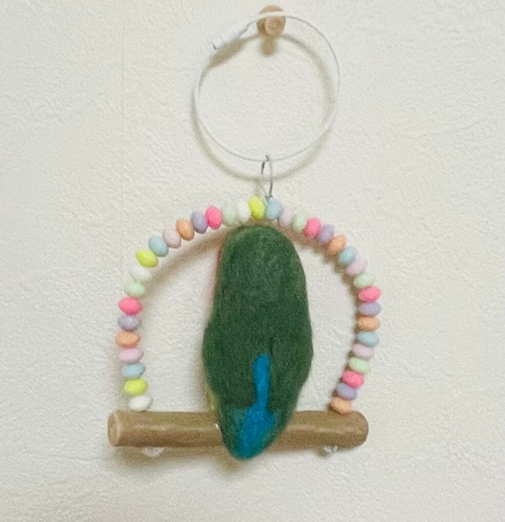 羊毛フェルト等で可愛いコザクラインコブランコバッグチャームを作製致しました^ - ^