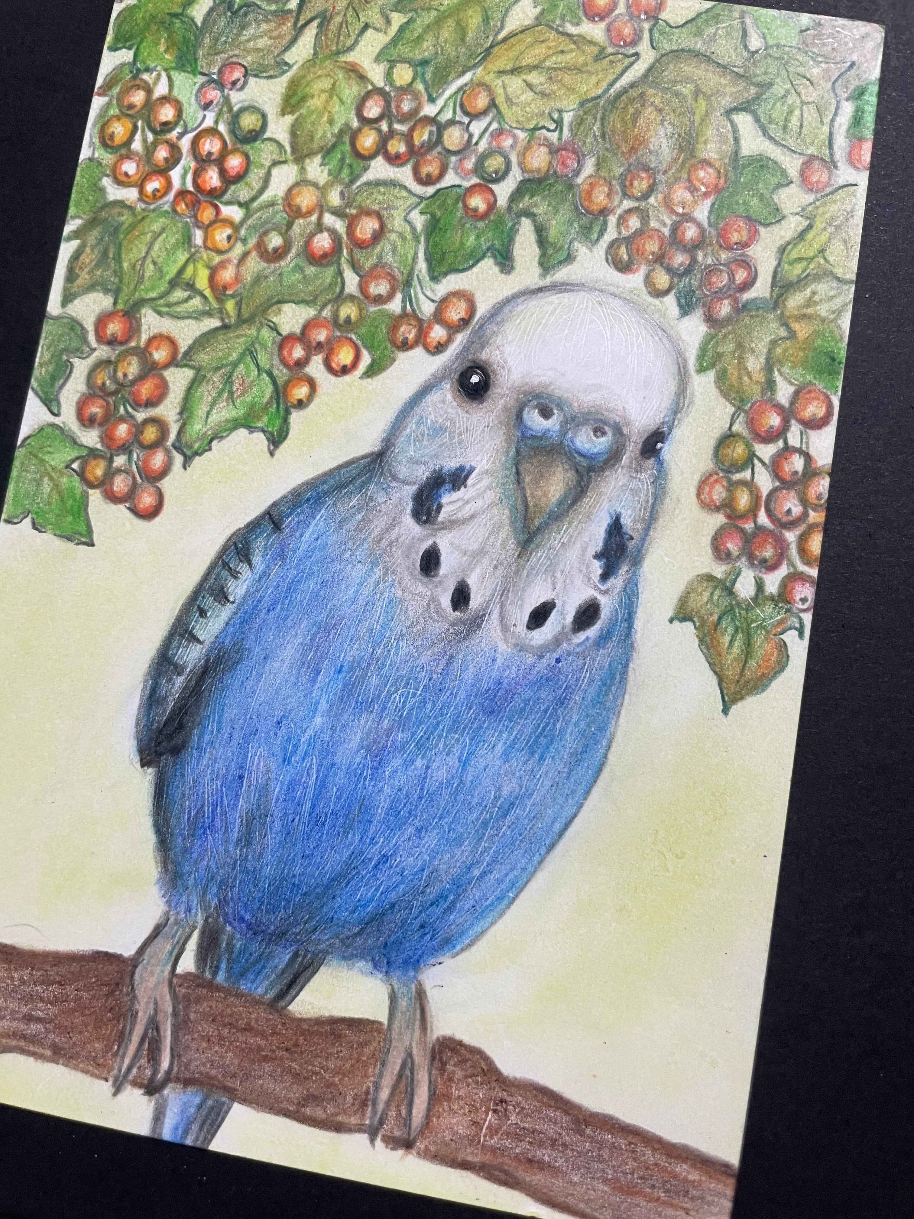 色鉛筆で、大好きなセキセイインコちゃんを描きました^ ^ 画像の様に、観る角度で楽しめます^o^