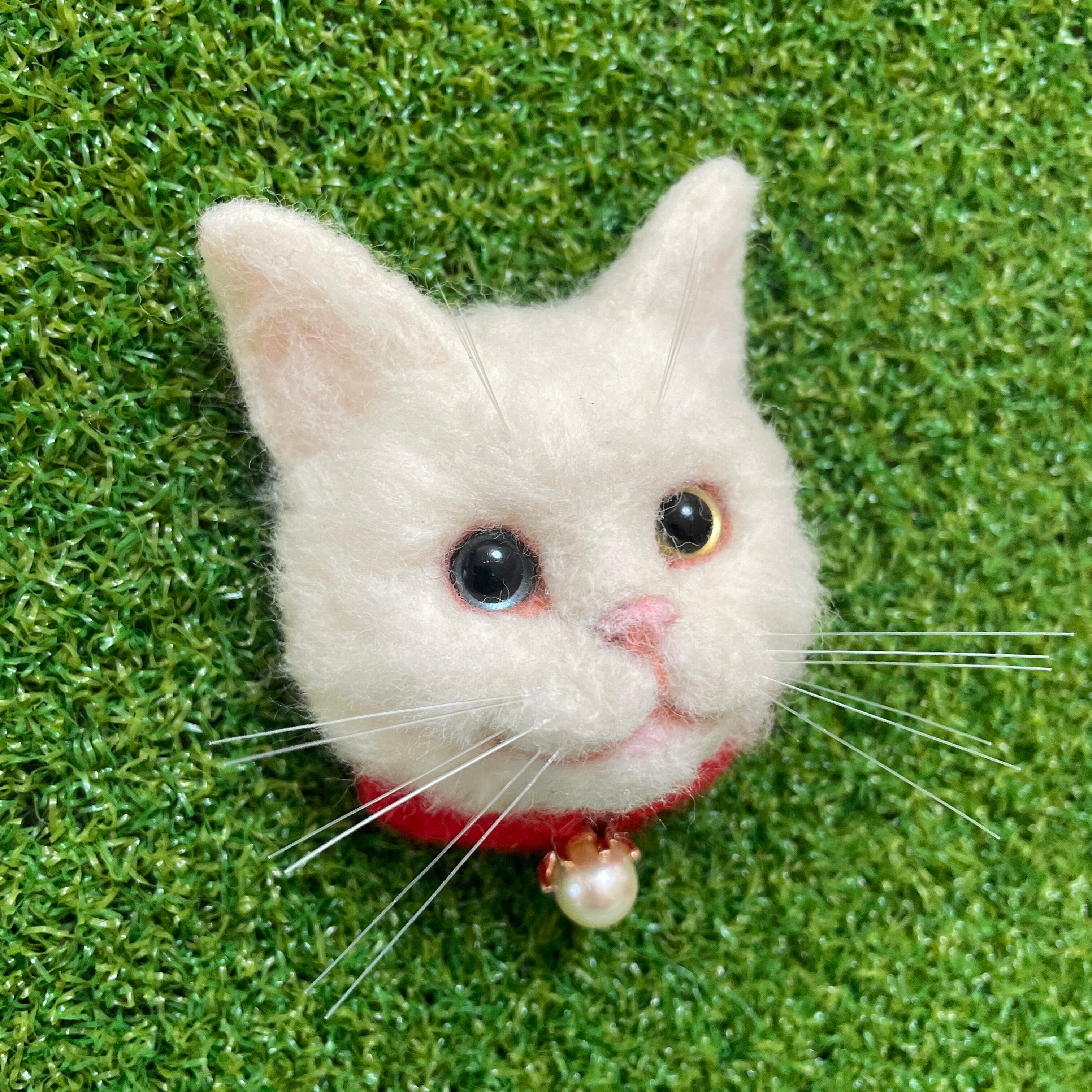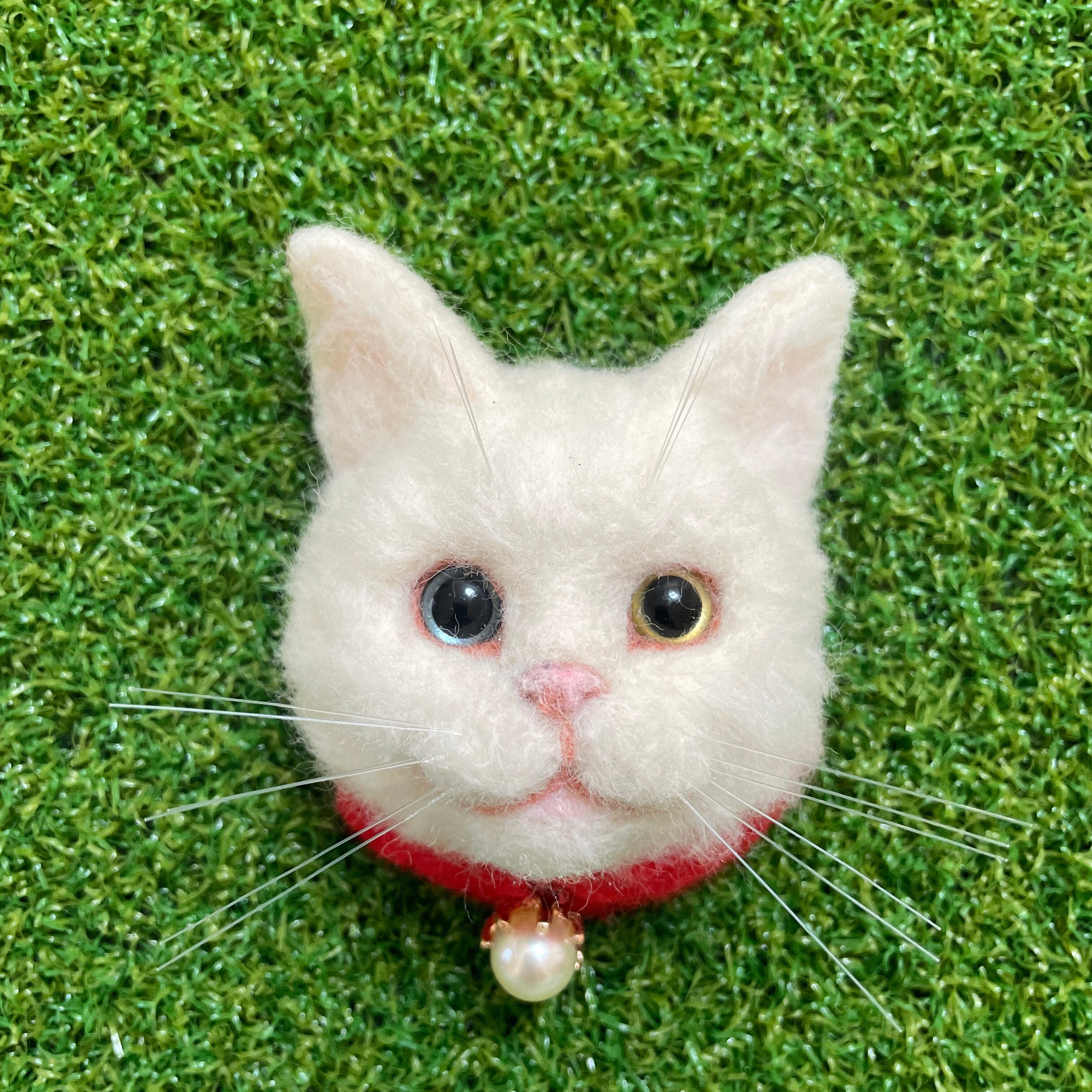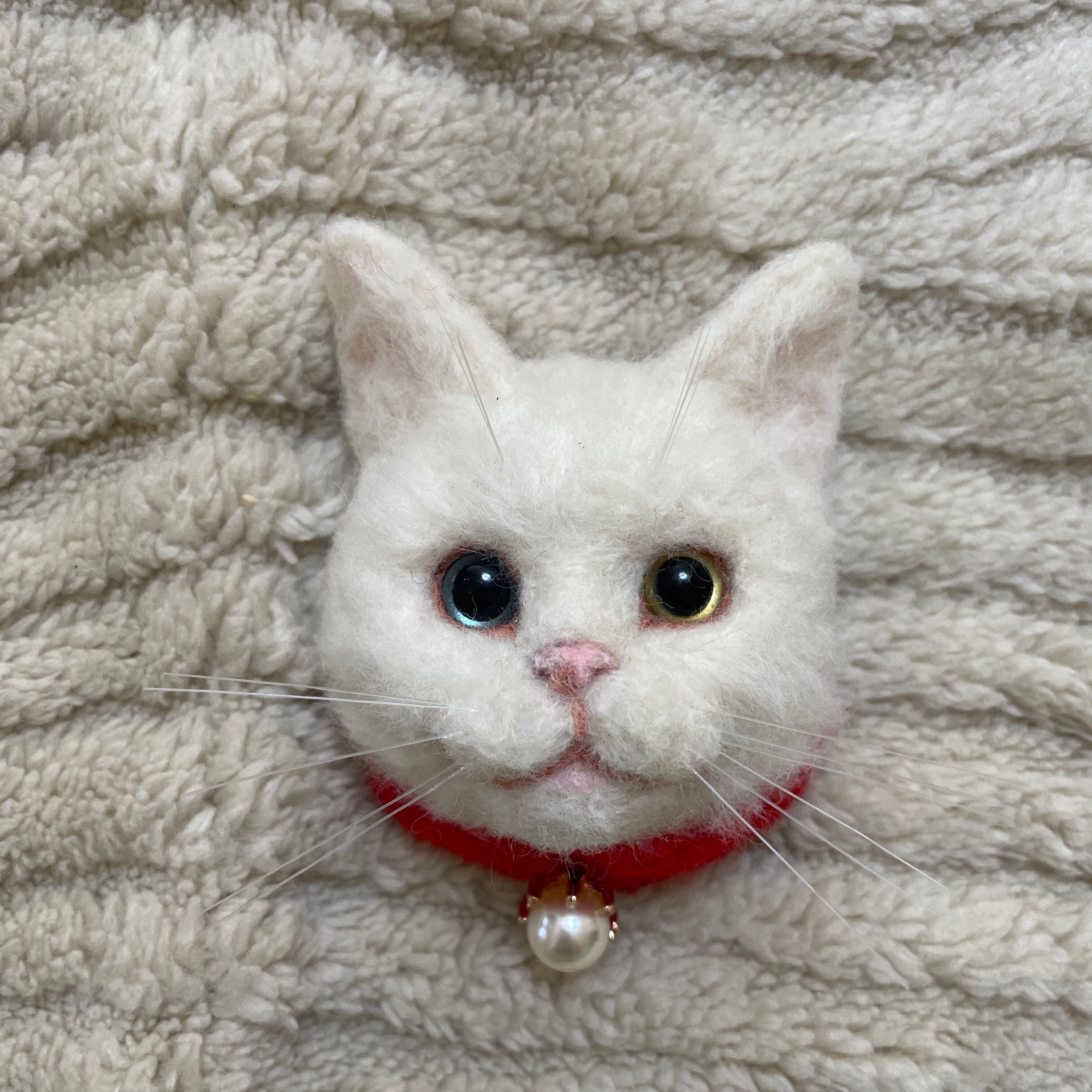 羊毛フェルト リアル可愛い白猫 オッドアイ ブローチ ゆこりん工房