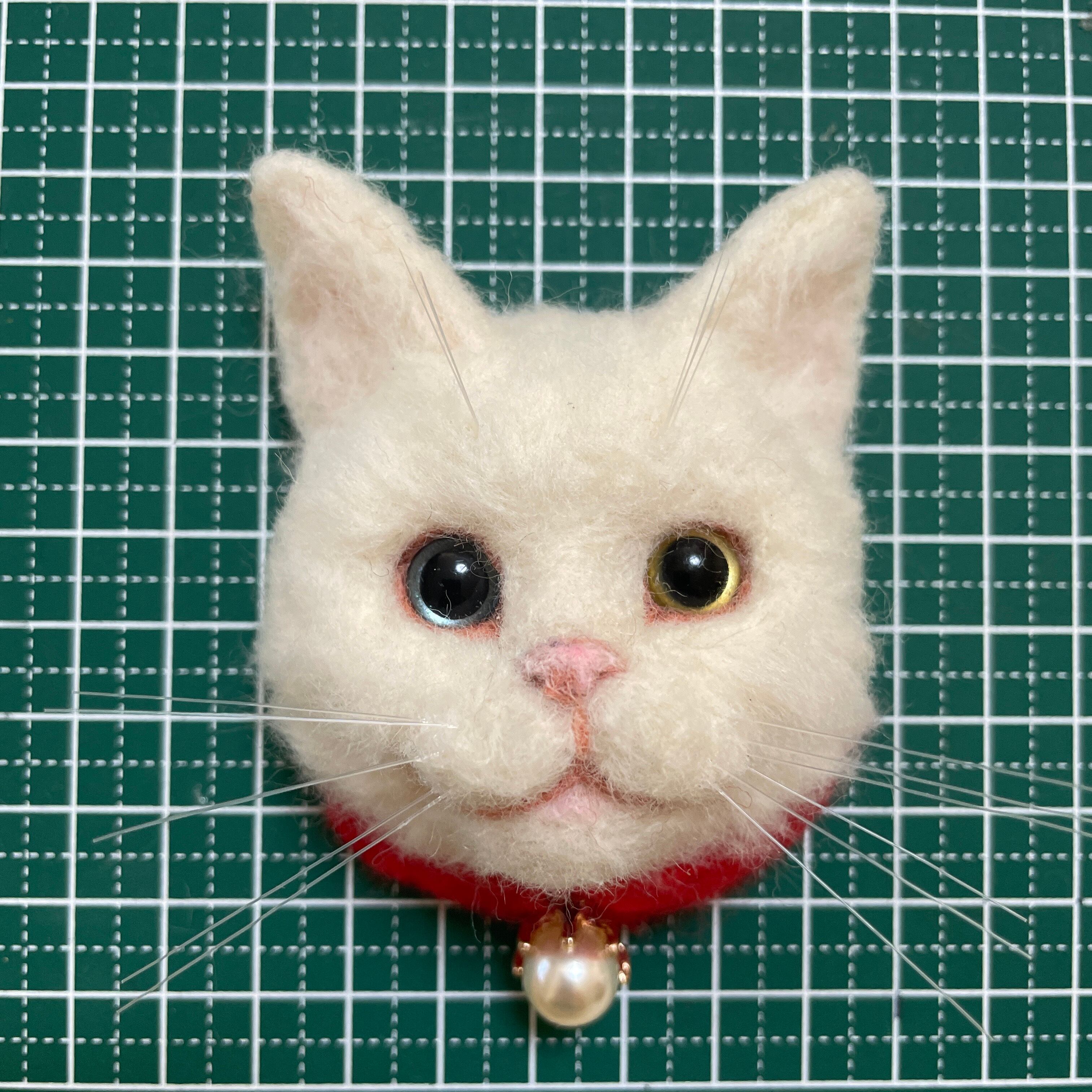 羊毛フェルト等でオッドアイの白猫ブローチを作製致しました^ - ^