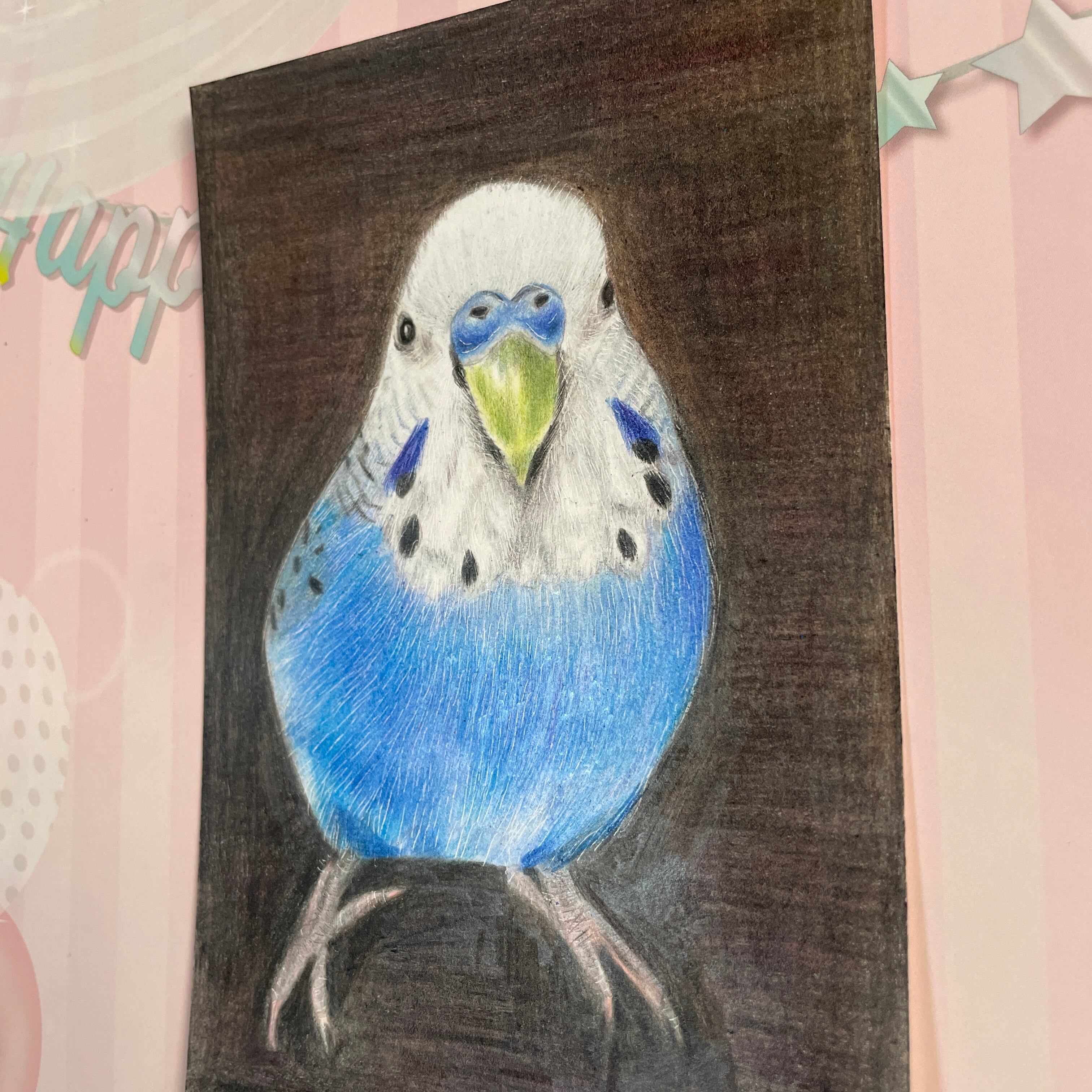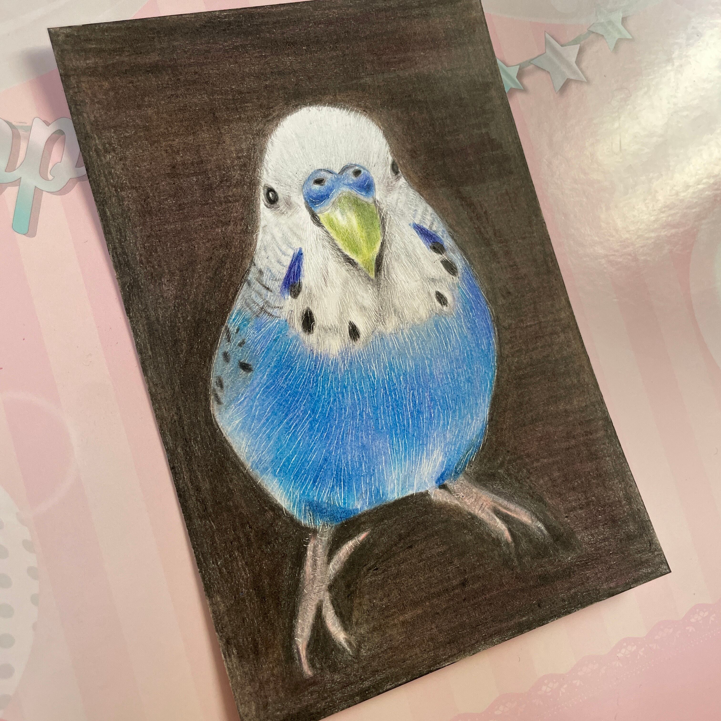 色鉛筆で、大好きなセキセイインコちゃんを描きました^ ^ 画像の様に、観る角度で楽しめます^o^